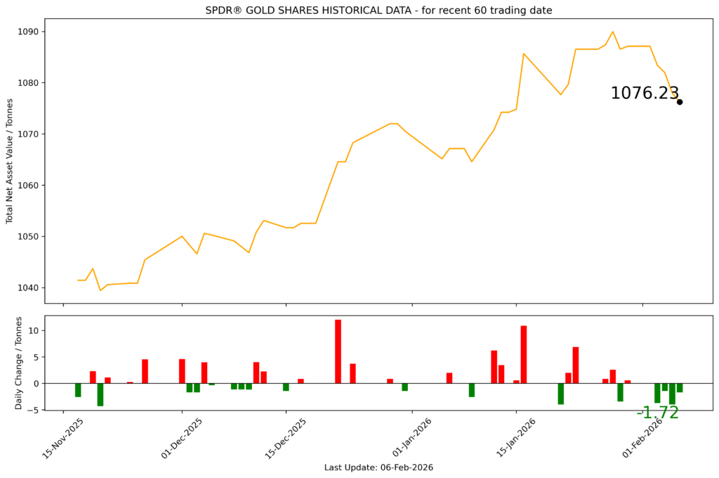 截至2026年2月6日,全球最大的黄金ETF SPDR Gold Trust持仓量为1076.23吨,较上一个交易日减少1.72吨。2026年2月6日现货黄金自4782.49美元/盎司开盘后先延续前日收盘跌势下砸至4655.295美元/盎司,后迅速拉升收复全部失地;全天震荡上行,最高向上触及4971.39美元/盎司,最终收于4967.27美元/盎司,涨190.79美元或3.99%。